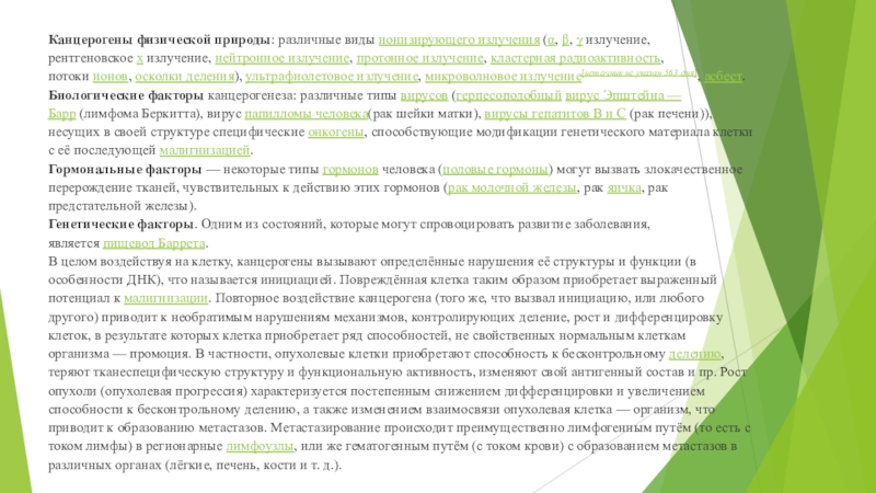 Слайд 9Канцерогены физической природы: различные виды ионизирующего излучения (α, β, γ излучение, рентгеновское x излучение, нейтронное излучение, протонное излучение, кластерная радиоактивность, потоки ионов, осколки
