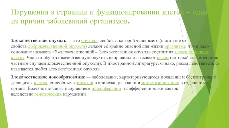 Злока́чественное новообразова́ние — заболевание, характеризующееся появлением бесконтрольно делящихся клеток, способных к инвазии в прилежащие ткани и метастазированию в отдаленные органы. Болезнь связана с нарушением пролиферации и дифференцировки клеток вследствие генетических нарушений.
