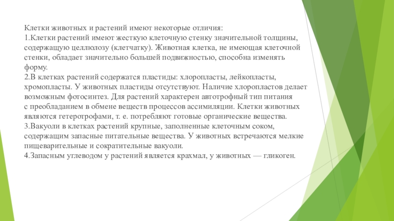 2.В клетках растений содержатся пластиды: хлоропласты, лейкопласты, хромопласты. У животных пластиды отсутствуют. Наличие хлоропластов делает возможным фотосинтез. Для растений характерен автотрофный тип питания с преобладанием в обмене веществ процессов ассимиляции. Клетки животных являются гетеротрофами, т. е. потребляют готовые органические вещества.