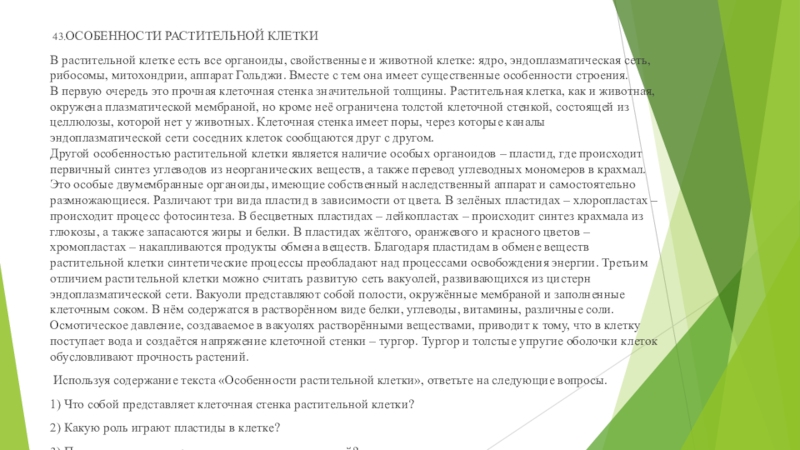 Используя содержание текста «Особенности растительной клетки», ответьте на следующие вопросы.