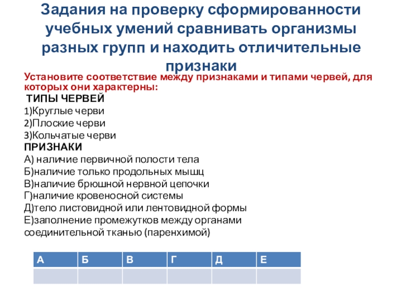 Установите соответствие между признаками и типами червей, для которых они характерны: