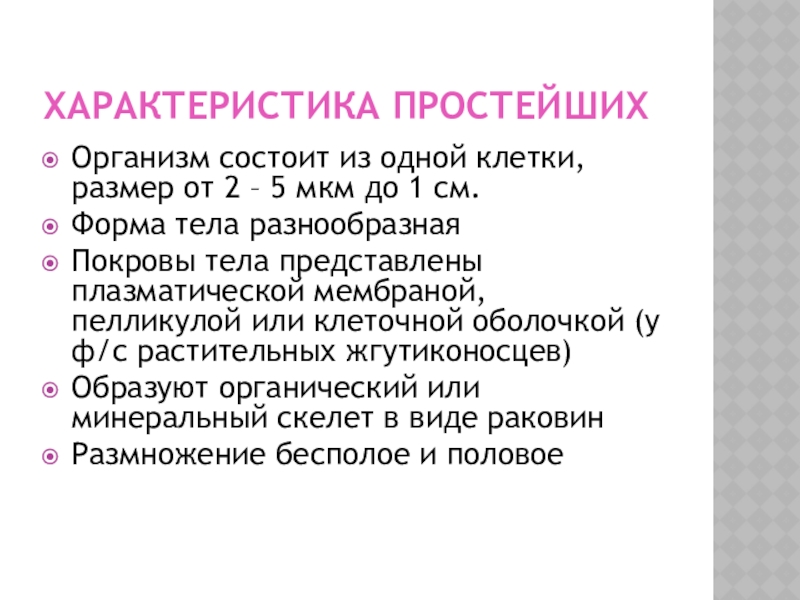 Характеристика простейших Организм состоит из одной клетки, размер от 2 – 5 мкм до 1 см.Форма тела
