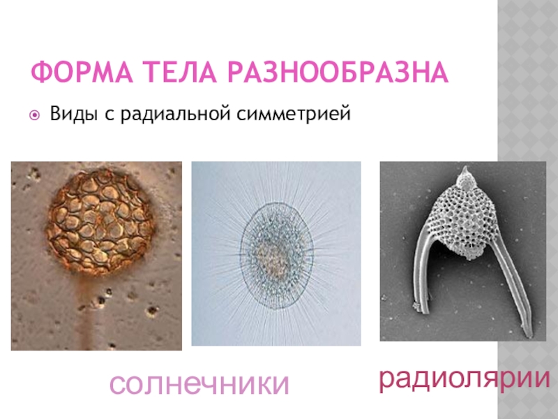 Форма тела разнообразнаВиды с радиальной симметриейсолнечникирадиолярии
