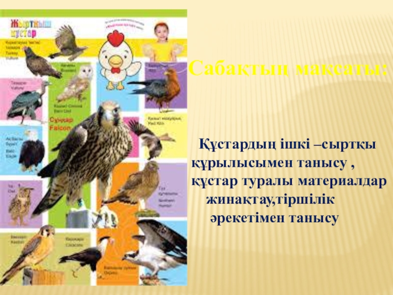 Сабақтың мақсаты: Құстардың ішкі –сыртқы құрылысымен танысу , құстар туралы материалдар  жинақтау,тіршілік   әрекетімен танысу