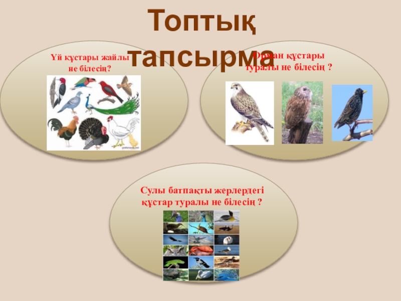 Топтық тапсырмаҮй құстары жайлыне білесің? Орман құстары туралы не білесің ?Сулы батпақты жерлердегіқұстар туралы не білесің ?