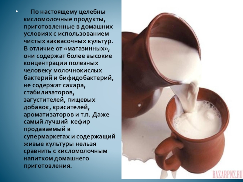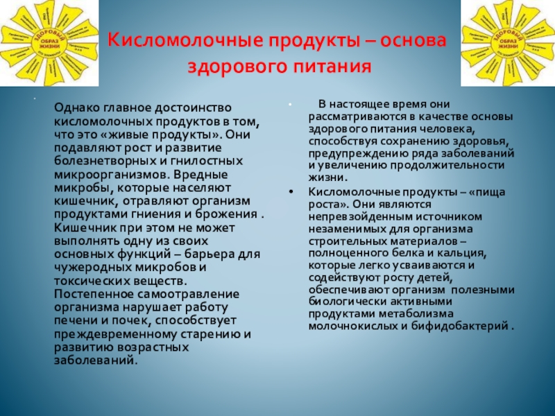 Кисломолочные продукты – «пища роста». Они являются непревзойденным источником незаменимых для организма строительных материалов – полноценного белка и кальция, которые легко усваиваются и содействуют росту детей, обеспечивают организм полезными биологически активными продуктами метаболизма молочнокислых и бифидобактерий .