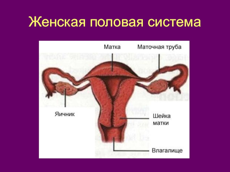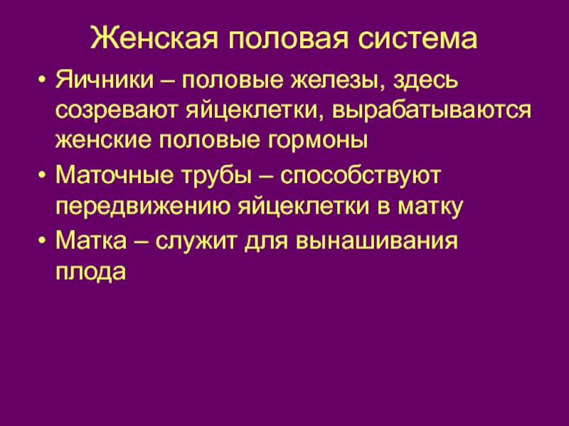 Женская половая системаЯичники – половые железы, здесь созревают яйцеклетки, вырабатываются женские половые гормоныМаточные трубы – способствуют передвижению