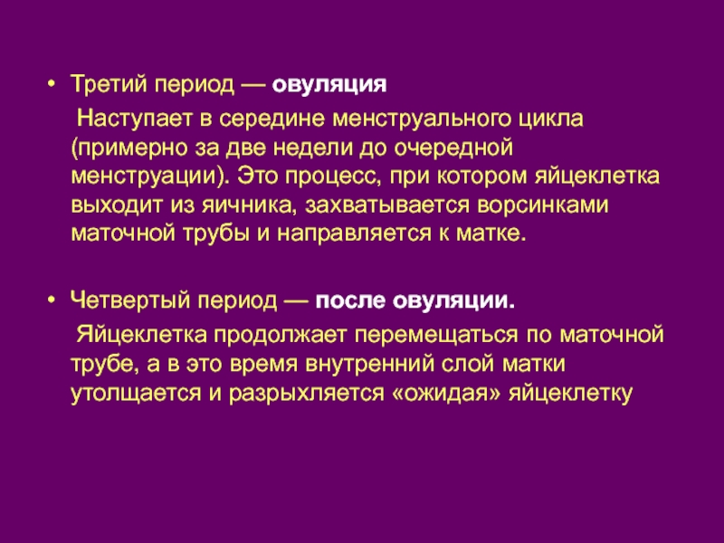 Третий период — овуляция   Наступает в середине менструального цикла (примерно за две недели до очередной