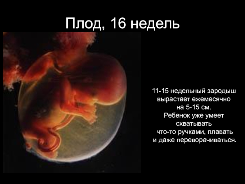 Плод, 16 недель11-15 недельный зародыш вырастает ежемесячно на 5-15 см. Ребенок уже умеет схватывать что-то ручками, плавать