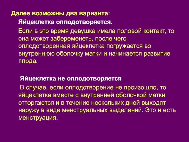 Далее возможны два варианта:  Яйцеклетка оплодотворяется.  Если в это время девушка имела половой контакт, то