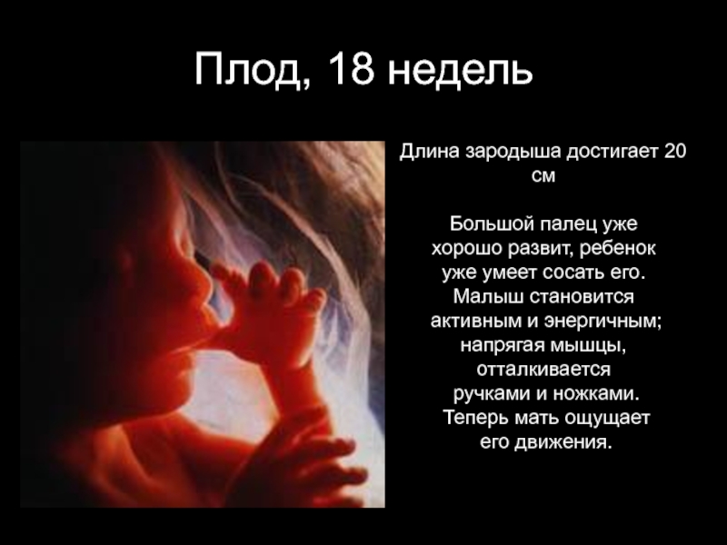 Плод, 18 недельДлина зародыша достигает 20 смБольшой палец уже хорошо развит, ребенок уже умеет сосать его. Малыш