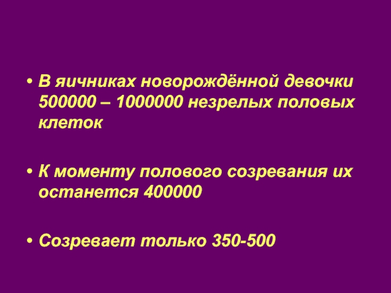 В яичниках новорождённой девочки 500000 – 1000000 незрелых половых клетокК моменту полового созревания их останется 400000Созревает только
