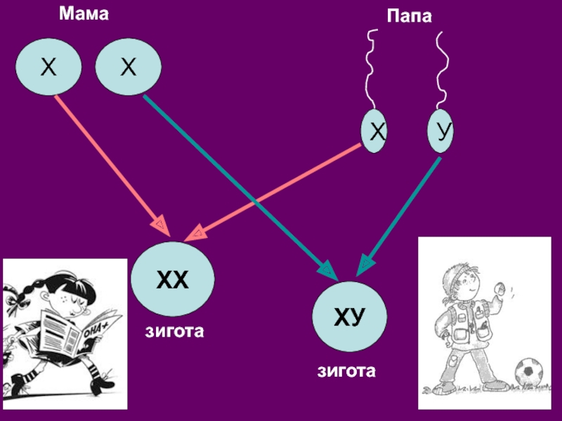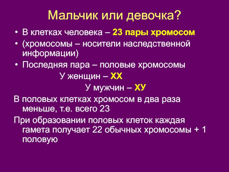 Мальчик или девочка?В клетках человека – 23 пары хромосом(хромосомы – носители наследственной информации)Последняя пара – половые хромосомы				У