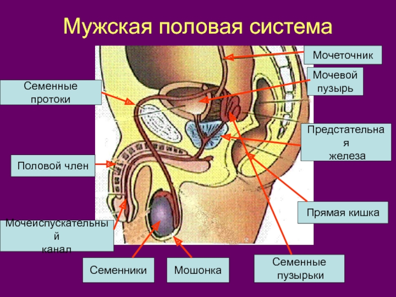 Мужская половая системаМочевой пузырьМочеточникСеменные протокиПредстательная железаСеменникиМошонкаПоловой членМочеиспускательныйканалПрямая кишкаСеменные пузырьки