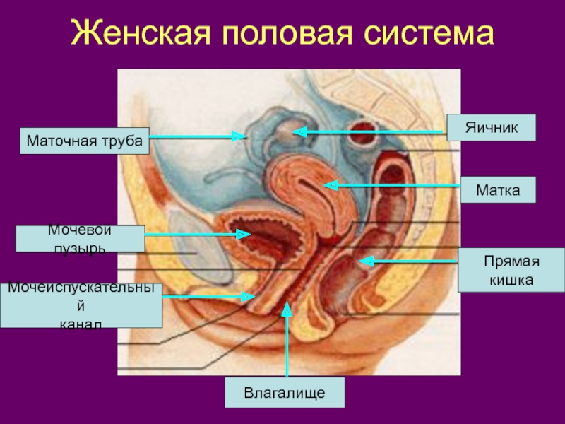 Женская половая системаЯичникМаточная трубаМаткаМочевой пузырьМочеиспускательныйканалВлагалищеПрямая кишка