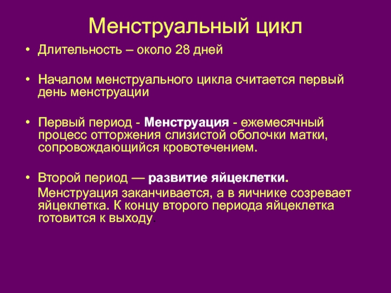 Менструальный циклДлительность – около 28 дней Началом менструального цикла считается первый день менструацииПервый период - Менструация -