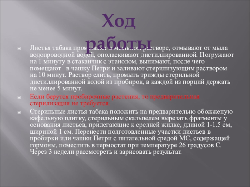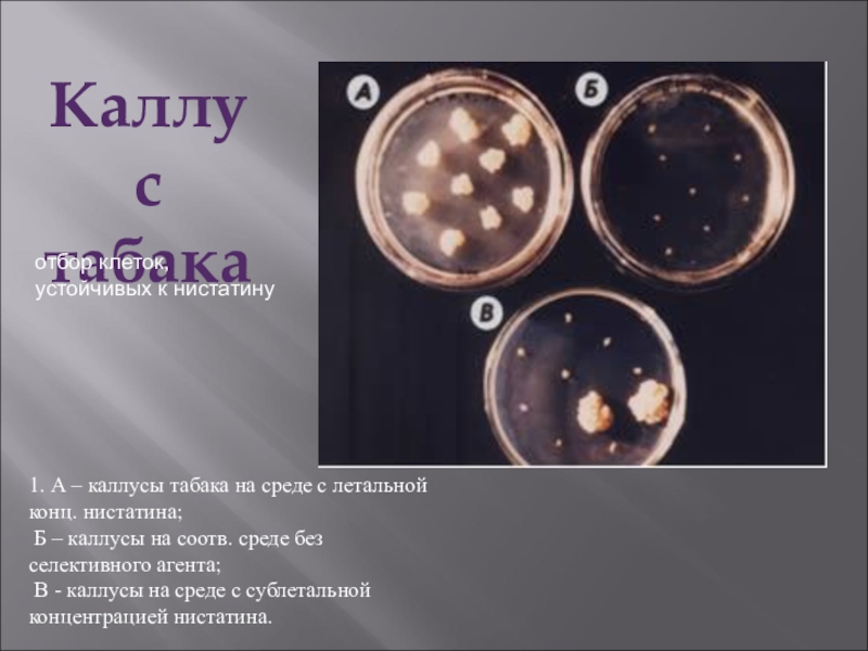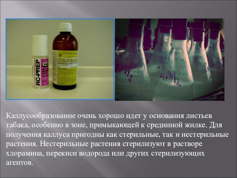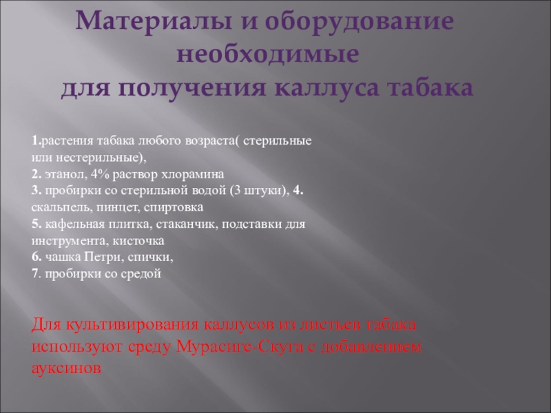 Для культивирования каллусов из листьев табака используют среду Мурасиге-Скуга с добавлением ауксинов