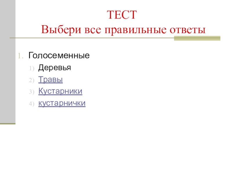 ТЕСТ  Выбери все правильные ответыГолосеменныеДеревьяТравыКустарникикустарнички