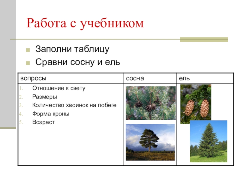 Работа с учебникомЗаполни таблицуСравни сосну и ель