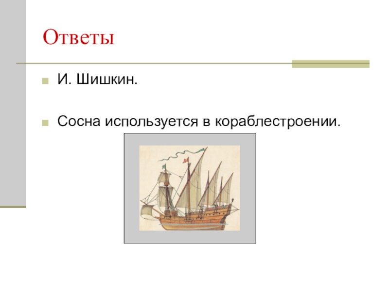ОтветыИ. Шишкин.Сосна используется в кораблестроении.