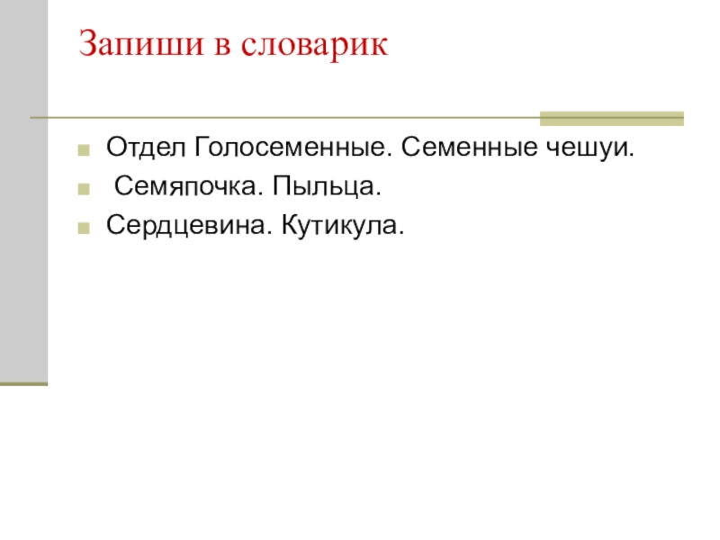 Запиши в словарик Отдел Голосеменные. Семенные чешуи. Семяпочка. Пыльца. Сердцевина. Кутикула.