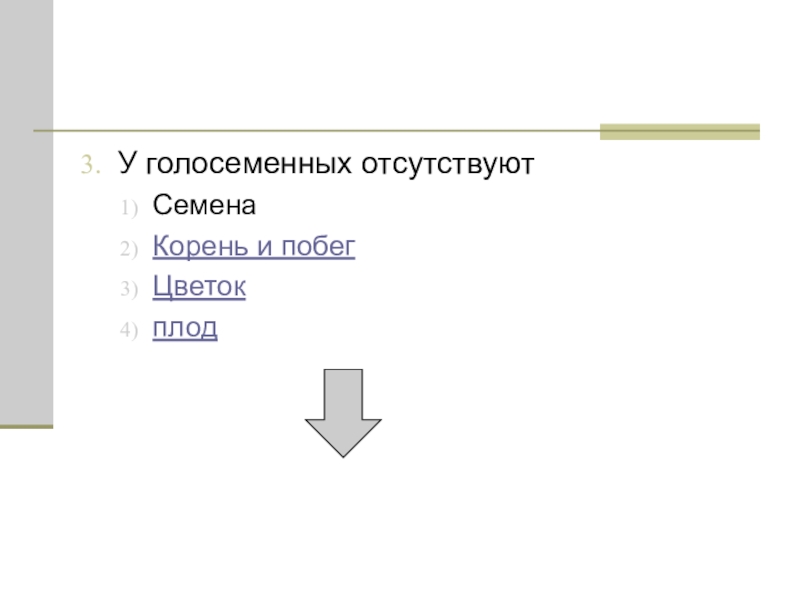 У голосеменных отсутствуютСеменаКорень и побег Цветок плод