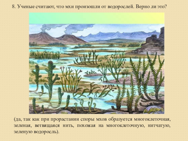 (да, так как при прорастании споры мхов образуется многоклеточная, зеленая, ветвящаяся нить, похожая на многоклеточную, нитчатую, зеленую водоросль).