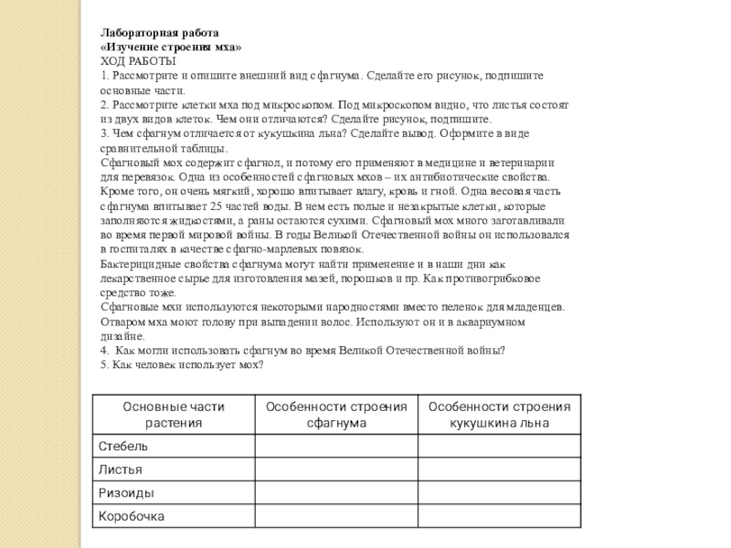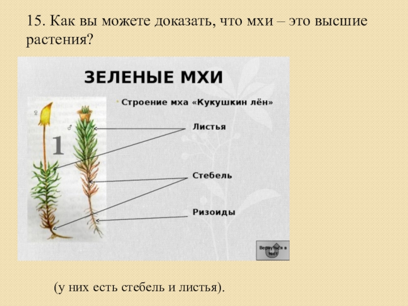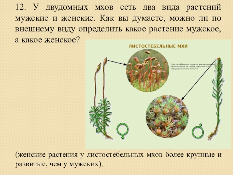 (женские растения у листостебельных мхов более крупные и развитые, чем у мужских).
