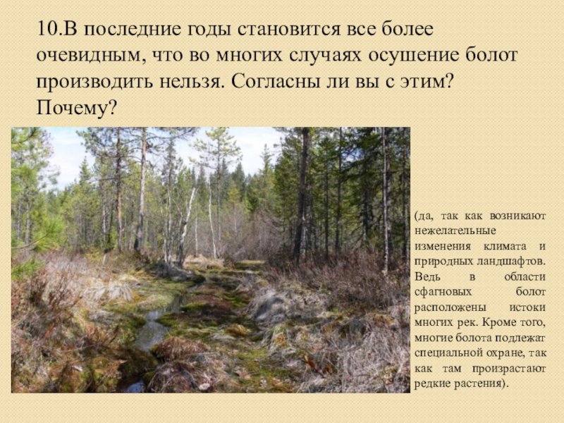 (да, так как возникают нежелательные изменения климата и природных ландшафтов. Ведь в области сфагновых болот расположены истоки многих рек. Кроме того, многие болота подлежат специальной охране, так как там произрастают редкие растения).