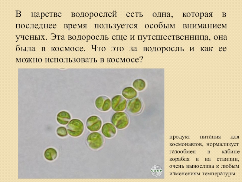 продукт питания для космонавтов, нормализует газообмен в кабине корабля и на станции, очень вынослива к любым изменениям температуры
