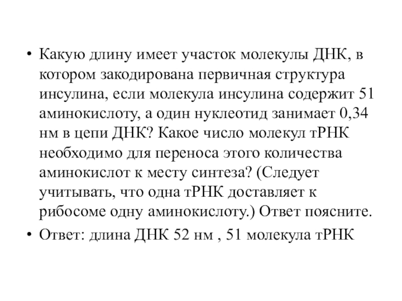 инсулина, если молекула инсулина содержит 51 аминокислоту, а один нуклеотид занимает 0,34 нм в цепи ДНК? Какое число молекул тРНК необходимо для переноса этого количества аминокислот к месту синтеза? (Следует учитывать, что одна тРНК доставляет к рибосоме одну аминокислоту.) Ответ поясните.