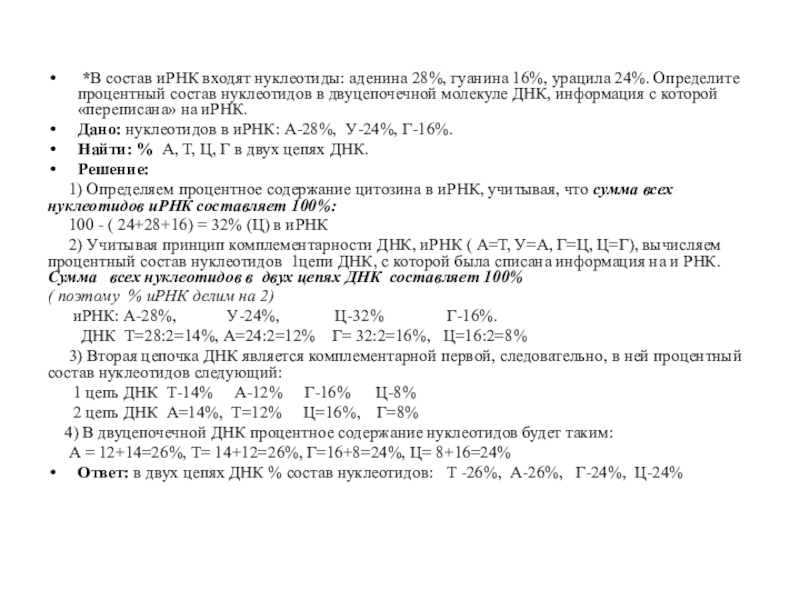 иРНК: А-28%, У-24%, Ц-32% Г-16%.
