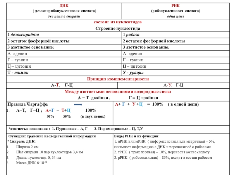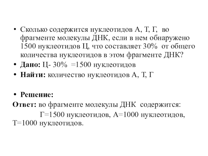 1) Согласно правилу Чаргаффа А+Г = Т+Ц, все нуклеотиды в ДНК составляют 100% или А+Г и Т+Ц по 50 %