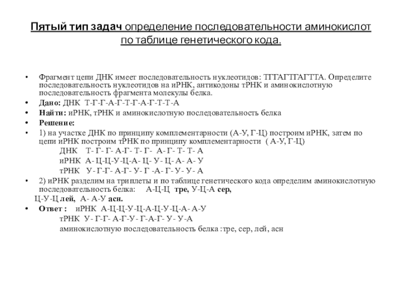 Слайд 16Пятый тип задач определение последовательности аминокислот по таблице генетического кода.