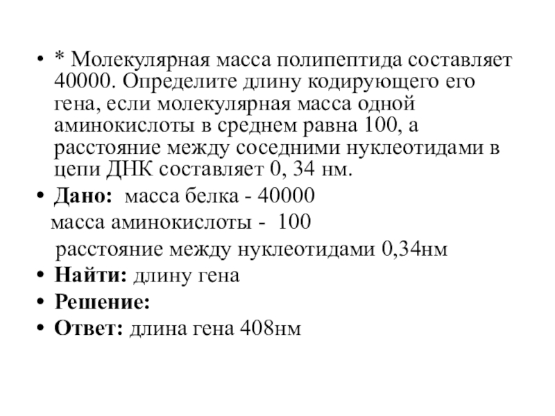 Слайд 21* Молекулярная масса полипептида составляет 40000. Определите длину кодирующего его гена,