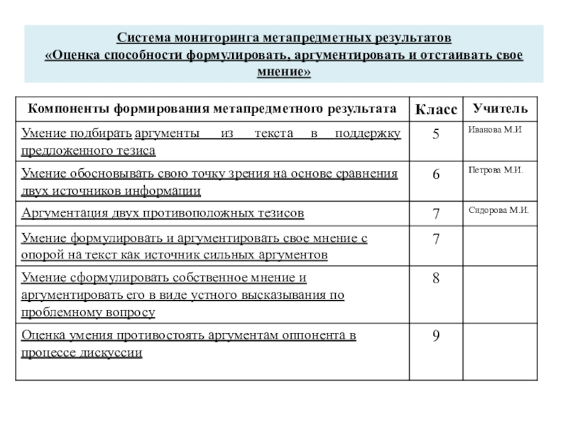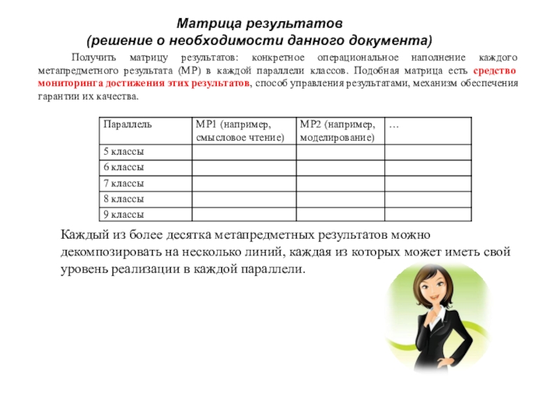 Каждый из более десятка метапредметных результатов можно декомпозировать на несколько линий, каждая из которых может иметь свой уровень реализации в каждой параллели.