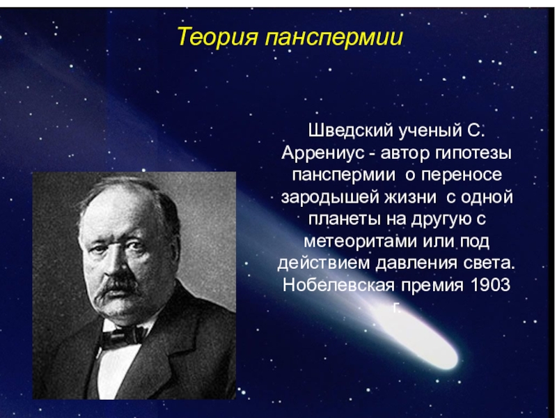 Шведский ученый С. Аррениус - автор гипотезы панспермии о переносе зародышей жизни с одной планеты на другую с метеоритами или под действием давления света. Нобелевская премия 1903 г.