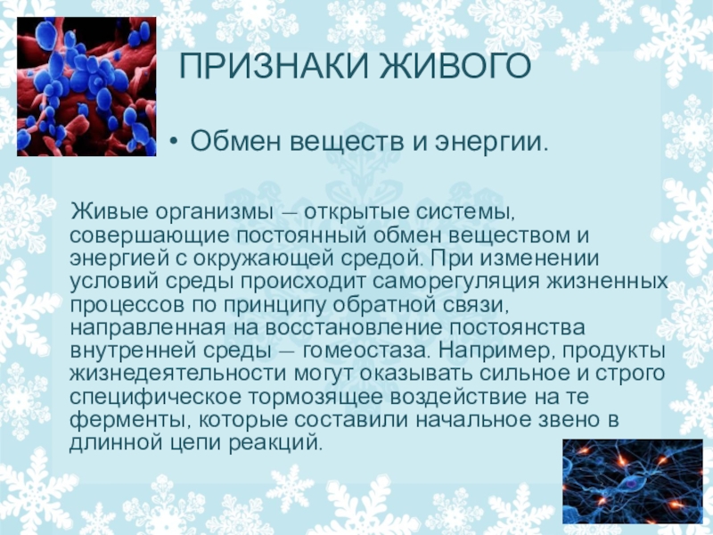 совершающие постоянный обмен веществом и энергией с окружающей средой. При изменении условий среды происходит саморегуляция жизненных процессов по принципу обратной связи, направленная на восстановление постоянства внутренней среды — гомеостаза. Например, продукты жизнедеятельности могут оказывать сильное и строго специфическое тормозящее воздействие на те ферменты, которые составили начальное звено в длинной цепи реакций.
