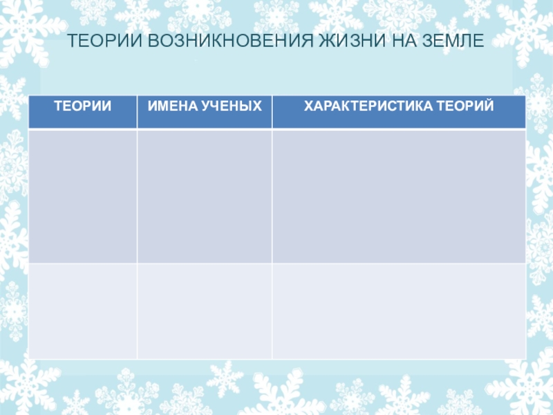 Слайд 27ТЕОРИИ ВОЗНИКНОВЕНИЯ ЖИЗНИ НА ЗЕМЛЕ