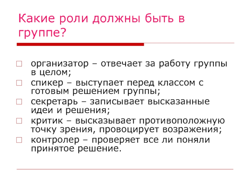 Слайд 9Какие роли должны быть в группе?