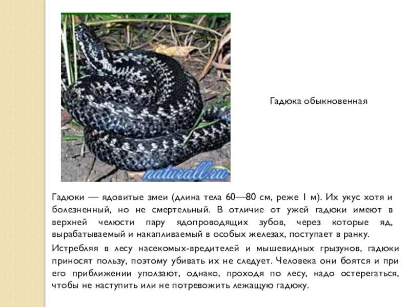 Истребляя в лесу насекомых-вредителей и мышевидных грызунов, гадюки приносят пользу, поэтому убивать их не следует. Человека они боятся и при его приближении уползают, однако, проходя по лесу, надо остерегаться, чтобы не наступить или не потревожить лежащую гадюку.