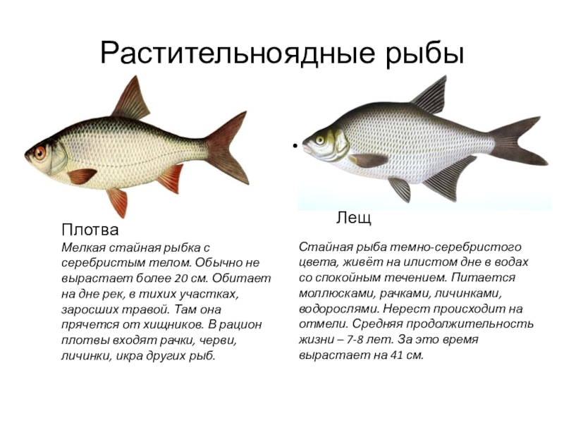 Мелкая стайная рыбка с серебристым телом. Обычно не вырастает более 20 см. Обитает на дне рек, в тихих участках, заросших травой. Там она прячется от хищников. В рацион плотвы входят рачки, черви, личинки, икра других рыб.