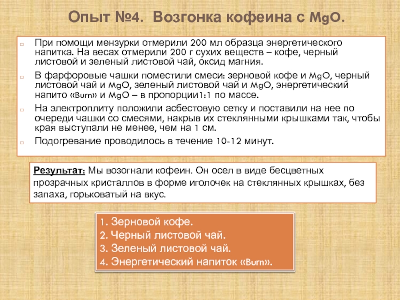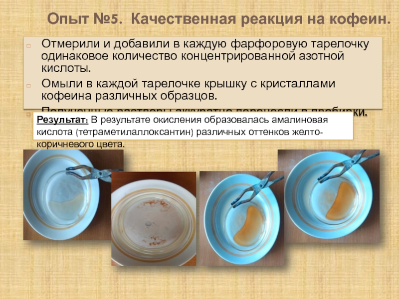 Результат: Мы возогнали кофеин. Он осел в виде бесцветных прозрачных кристаллов в форме иголочек на стеклянных крышках, без запаха, горьковатый на вкус.