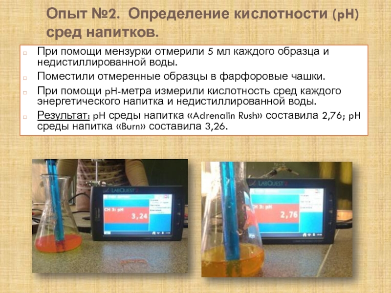 Исследовать pH (кислотность) сред напитков, наличие консервантов