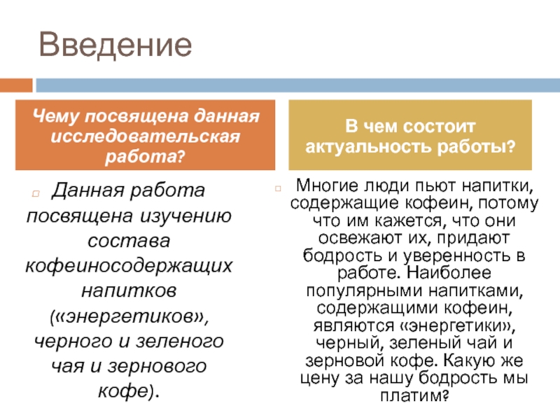 Многие люди пьют напитки, содержащие кофеин, потому что им кажется, что они освежают их, придают бодрость и уверенность в работе. Наиболее популярными напитками, содержащими кофеин, являются «энергетики», черный, зеленый чай и зерновой кофе. Какую же цену за нашу бодрость мы платим?