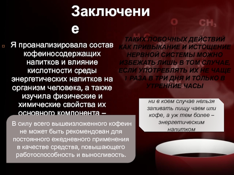 В силу всего вышеизложенного кофеин не может быть рекомендован для постоянного ежедневного применения в качестве средства, повышающего работоспособность и выносливость.