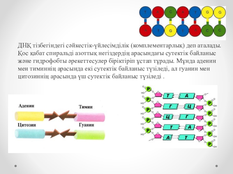 Слайд 4ДНҚ тiзбегiндегi сәйкестiк-үйлесiмдiлiк (комплементарлық) деп аталады. Қос қабат спиральдi азоттық негiздердiң