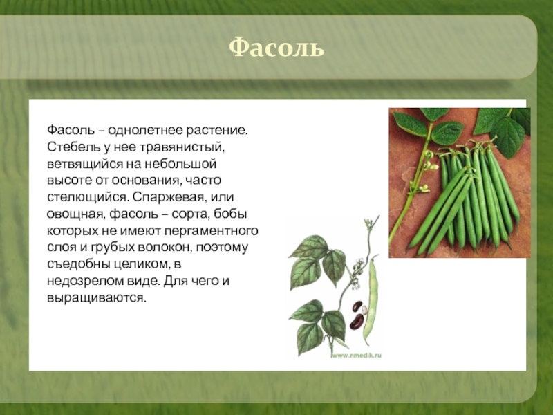 ФасольФасоль – однолетнее растение. Стебель у нее травянистый, ветвящийся на небольшой высоте от основания, часто стелющийся. Спаржевая, или