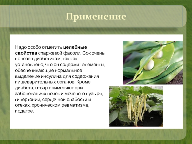 ПрименениеНадо особо отметить целебные свойства спаржевой фасоли. Сок очень полезен диабетикам, так как установлено, что он содержит элементы, обеспечивающие