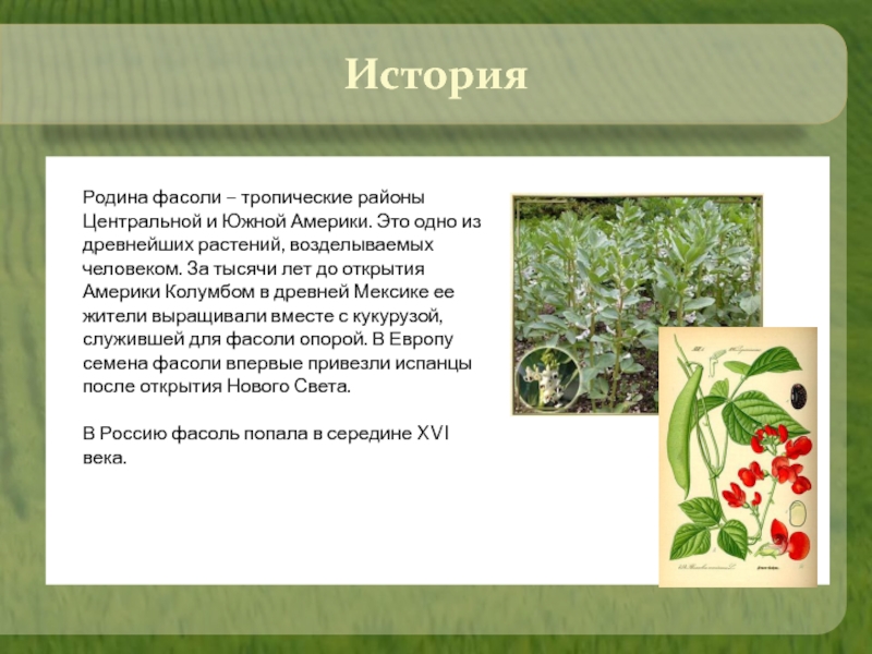 из древнейших растений, возделываемых человеком. За тысячи лет до открытия Америки Колумбом в древней Мексике ее жители выращивали вместе с кукурузой, служившей для фасоли опорой. В Европу семена фасоли впервые привезли испанцы после открытия Нового Света.